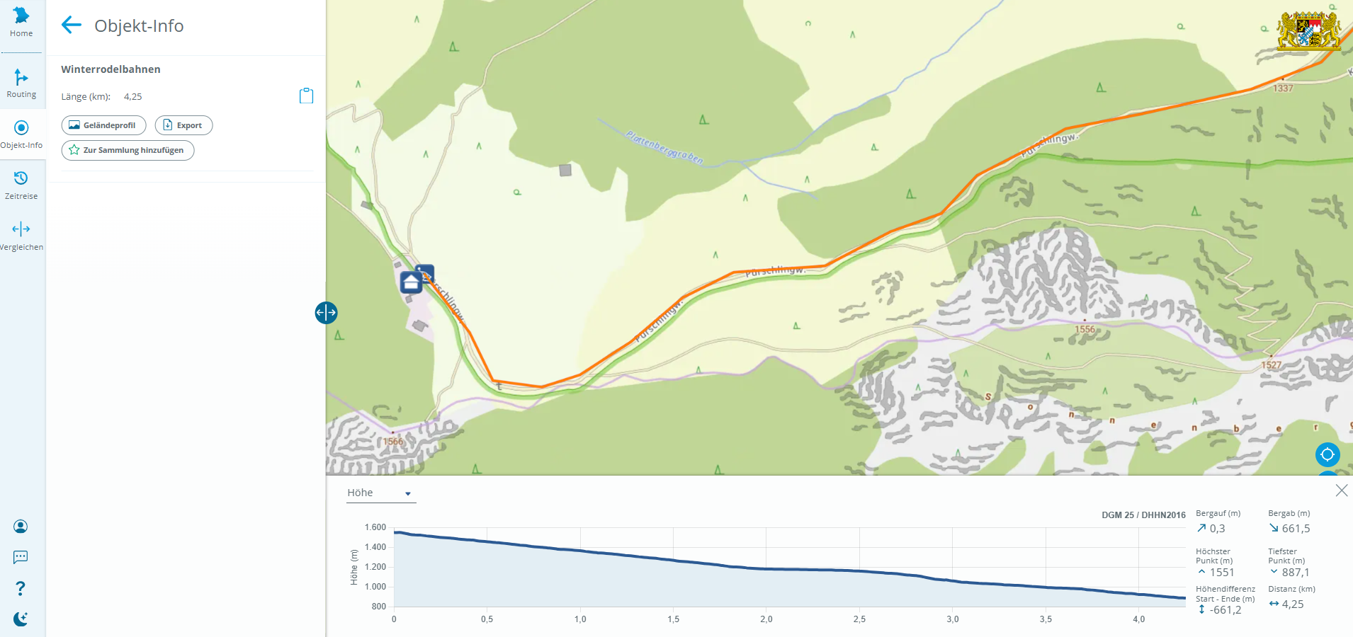 Im BayernAtlas können im Thema Sport und Freizeit (externer Link, öffnet in neuem Tab) unter der Rubrik Freizeitaktivitäten verschiedene Winterrodelbahnen und Eislaufmöglichkeiten angezeigt werden. Der Layer Eislaufsport beinhaltet neben Kunsteisstadien (mit und ohne Überdachung) auch Natureisplätze, die bei entsprechenden winterlichen Verhältnissen genutzt werden können. Mit einem Klick auf ein Eislaufsymbol werden als Objekt-Info die Adresse sowie ein Link zur Internetseite der entsprechenden Eislaufmöglichkeit angezeigt. Wählt man die Ebene Winterrodelbahnen aus, so können mithilfe der Objekt-Info die Streckenlänge der Rodelbahn sowie das dazugehörige Höhenprofil angezeigt werden. Ebenfalls unter der Objekt-Info kann die Rodelstrecke bei Bedarf als Vektordatei in verschiedenen Formaten zur weiteren Verwendung auf einem mobilen Endgerät heruntergeladen werden.