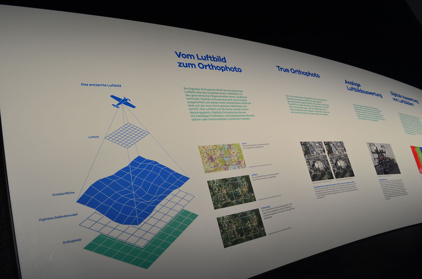 An der Recherchestation können Luftbilder aus ganz Bayern aufgerufen werden. Dabei werden Veränderungen von Landschaften und Städten gut sichtbar. Ein virtueller Flug über die Zugspitze, der Blick durch eine Anaglyphenbrille oder durch ein Stereoskop machen deutlich, wie Gebäude und Landschaften in Luftbildern zu dreidimensionalen Objekten werden.
